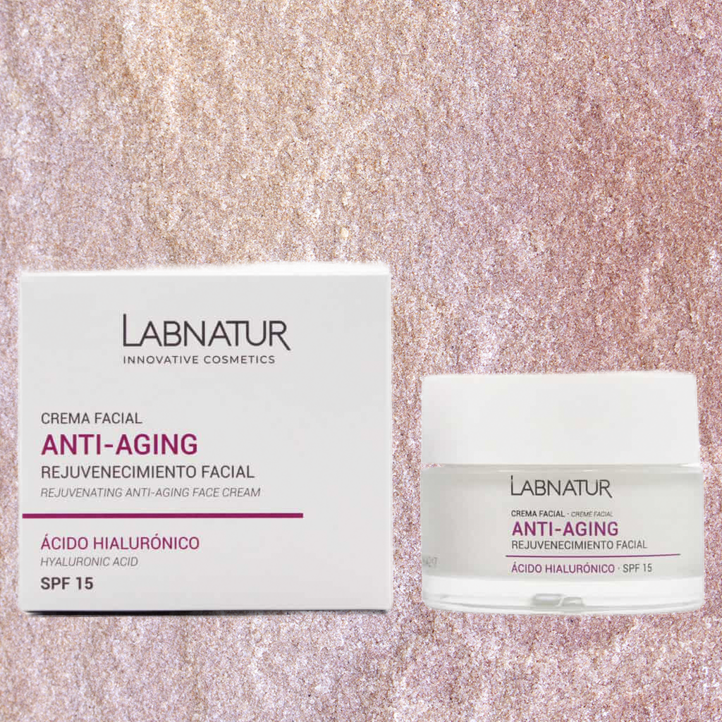 La Crema Facial Anti-Aging de Labnatur proporciona a la piel una hidratación profunda y equilibra la pérdida de humedad. Aporta firmeza, tersura y luminosidad a la piel. Como resultado, obtenemos una piel visiblemente más joven y sana. Con la edad, la piel pierde volumen, firmeza e hidratación y comienzan a aparecer pequeñas arrugas. La Crema Facial Anti-Aging es una crema antiarrugas e hidratante muy eficaz, tanto en pieles sensibles como en pieles mixtas o maduras. Reúne las propiedades de los principios activos que la componen: ÁH y Protección Solar SPF 15. El ÁH reconstruye las fibras que sostienen los tejidos de la piel. Además, posee una gran capacidad para atraer y retener el agua de la dermis, lo que mejora su hidratación y equilibra la pérdida de humedad de la piel asociada a la edad. También previene y rellena las arrugas, ayuda a absorber grandes cantidades de agua y se expande, incrementado el volumen de la piel hasta 30 veces. Esto permite conseguir un increíble efecto rellenador de las líneas de expresión y las arrugas. Además, mejora el tono y acaba con la flacidez, dejando la piel más tersa y suave y previniendo la aparición de manchas en el rostro. El ÁH se ha convertido en un excelente aliado para prevenir y revertir los signos del envejecimiento de la piel. Es muy eficaz para eliminar los surcos nasogenianos y ayudar al rejuvenecimiento facial, dando al rostro un aspecto más joven, hidratado y saludable. Además, el ÁH es un componente 100% natural presente en nuestro organismo, por lo que se reabsorbe de forma natural. Ayuda a asegurar la estabilidad de la piel, manteniéndola protegida y renovada. Es un excelente aliado para retrasar la aparición de arrugas muy utilizado en tratamientos estéticos y medicina estética.