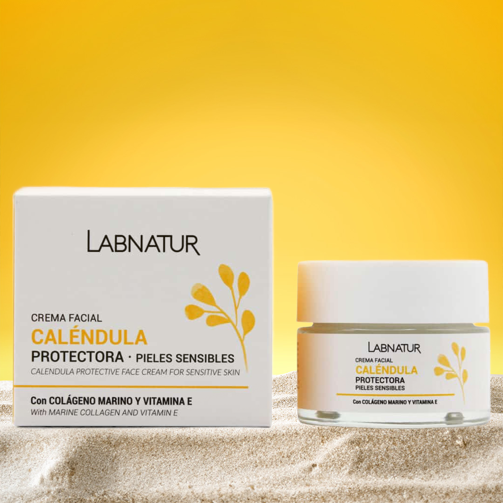 Reúne las propiedades de los principios activos que la componen: Caléndula, Colágeno Marino, Vitamina E, Camomila y Aceite de Almendras Dulces. También conocida como flor maravilla, la Caléndula posee una poderosa acción terapéutica, que regenera y nutre nuestra piel. Además, se usa mucho para tratar pieles dañadas o con quemaduras solares gracias a sus propiedades cicatrizantes. El Colágeno Marino destaca por sus propiedades hidratantes, regeneradoras y fotoprotectoras. Es ideal para proteger nuestra piel de factores externos como los rayos UV y la polución. Además, proporciona firmeza y elasticidad a la piel, ayudando a disminuir las arrugas y combatiendo la flacidez facial. La Vitamina E mejora el tono de la piel y actúa como antioxidante, ayudando a prevenir el envejecimiento prematuro de la piel. La Camomila destaca por su acción calmante y purificante. Además, su alto contenido en aceites esenciales la convierten en un componente esencial para el cuidado de pieles sensibles o dañadas. Por último, el Aceite de Almendras Dulces suaviza, hidrata y nutre la piel en profundidad. También tiene propiedades antienvejecimiento gracias a su alto contenido en Vitamina E, que ayuda a retrasar la aparición de arrugas y signos de la edad.